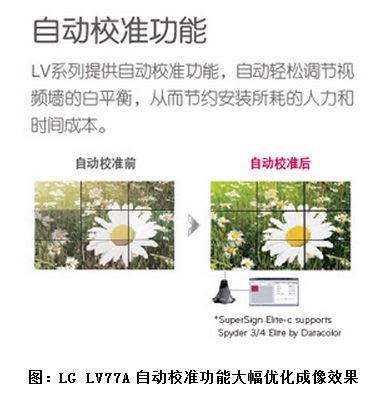 同時(shí),為保證成像的完整性,LG LV系列提供自動(dòng)校準(zhǔn)功能,LG LV77A能夠自動(dòng)輕松調(diào)解視頻墻的白平衡,從而有效節(jié)約安裝所消耗的人力和時(shí)間成本同時(shí)保證監(jiān)控大屏的內(nèi)容以最佳效果展示。