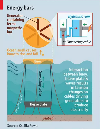 從海浪提取能源來發(fā)電是一個(gè)很誘人的創(chuàng)意。早在1974年,有人就進(jìn)行了首次嘗試,愛丁堡大學(xué)員工斯蒂芬˙索爾特(StephenSalter)就想出了一個(gè)名為“鴨子”的創(chuàng)意:將房子大小的浮標(biāo)系在海床上,利用浮標(biāo)將海浪上漲的能量轉(zhuǎn)變成旋轉(zhuǎn)運(yùn)動(dòng),從而驅(qū)動(dòng)發(fā)電機(jī)。這項(xiàng)嘗試失敗了,因?yàn)橐?qū)動(dòng)發(fā)電機(jī),還要進(jìn)行大量的后期工作。但利用海浪能源發(fā)電的創(chuàng)意卻沒有因此消失;最近,設(shè)在西雅圖的振蕩電力公司(OscillaPower)進(jìn)行了一次嘗試,試圖找到之前失敗的原因。