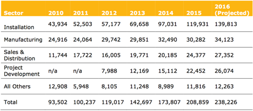 2010-2016年美國(guó)太陽(yáng)能行業(yè)就業(yè)的觀察和預(yù)期