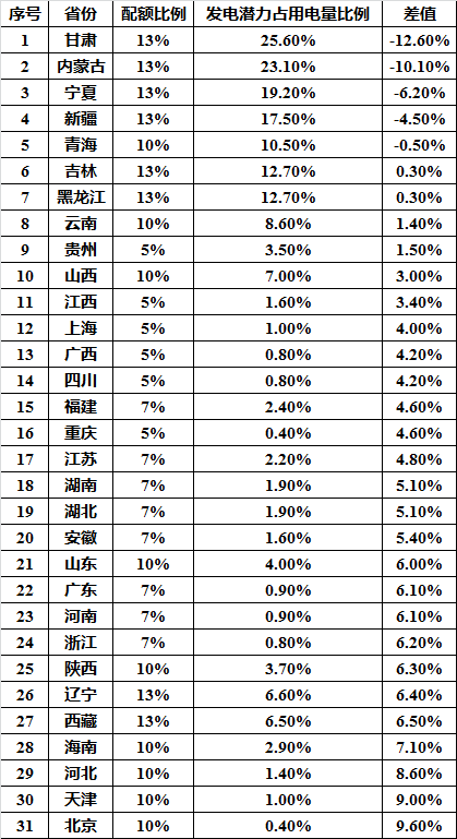 然而,哪些省份是買方?哪些省份是賣方?下表為“國家給各省的可再生能源配額”、“在不限電的情況下,各省風電、光伏可能的發電量占用電量的比例”以及兩者之間的差額。