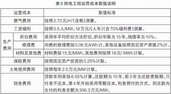 發(fā)電工程日常運營成本主要包括:燃氣費用、工資福利、生產(chǎn)費用(折舊費、修理費、材料費及其他費用)、土地費用和財務費用,具體取值標準如表5所示。