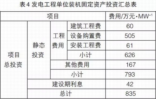綜上,發(fā)電工程的單位裝機固定投資成本為835萬元/MW,詳見表4所示。