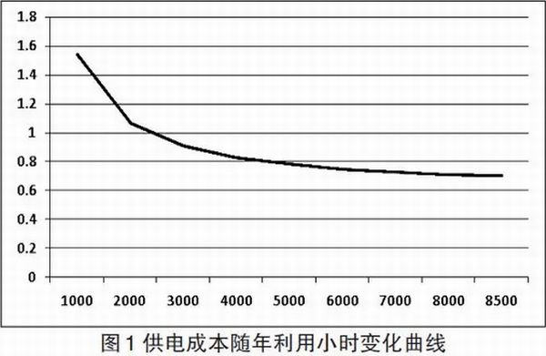 供電成本隨年發(fā)電利用小時數(shù)的變化曲線如圖1所示,從曲線來看,年利用小時數(shù)小于3000h,供電成本隨年利用小時數(shù)變化較大,年利用小時數(shù)大于3000h,供電成本隨年利用小時數(shù)的變化較小。