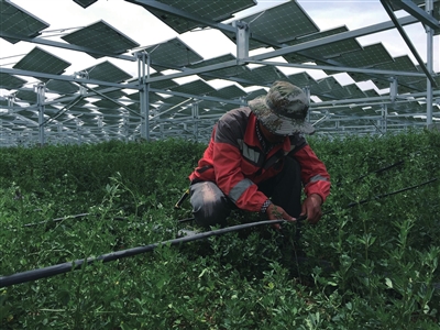 光伏發電板下,種植的苜蓿長勢良好,工作人員正在安裝澆灌苜蓿的水管。本報記者范曉儒攝