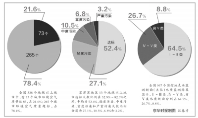 2015年,京津冀地區13個地級以上城市達標天數比例在32.9%~82.3%之間,平均為52.4%,比2014年上升9.6個百分點。輕度污染、中度污染、重度污染和嚴重污染天數比例分別為27.1%、10.5%、6.8%和3.2%。
