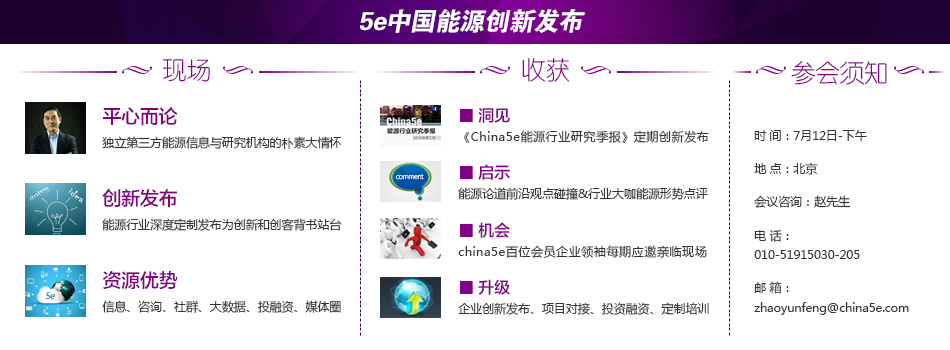 “5e中國能源創新發布”,是中國能源網(brumoxim.com)打造的能源領域創新發布與交流平臺。具體形式為定期、定點舉辦的深度企業定制發布會,每期邀請百位會員企業領袖親臨現場。如果您有創新理念、創新技術和創新成果,都可以聯系參與。