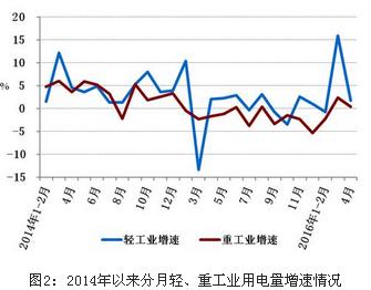 1-4月份,全國工業用電量12369億千瓦時,同比增長0.2%,增速比上年同期提高1.0個百分點,占全社會用電量的比重為68.4%,對全社會用電量增長的貢獻率為4.5%。其中,輕工業用電量2075億千瓦時,同比增長3.6%,增速比上年同期提高1.7個百分點;重工業用電量為10295億千瓦時,同比下降0.5%,增速比上年同期提高0.8個百分點。