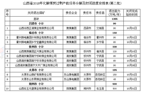 山西省煤炭工業廳發布公告稱,根據2016年山西第二批化解煤炭過剩產能任務分解及時間進度安排,山西將再關閉10座煤礦,退出煤炭產能1265萬噸/年。此前,山西第一批已安排關閉15座煤礦,退出煤炭產能1060萬噸/年。