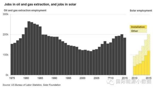 根據(jù)美國勞工部和太陽能基金會的數(shù)據(jù),2015年美國太陽能(主要是光伏)領(lǐng)域就業(yè)人數(shù)達到20萬人,超過了油氣上游(開采)企業(yè)的就業(yè)人數(shù)。而在光伏就業(yè)崗位中,超過大約60%從事光伏安裝工作。