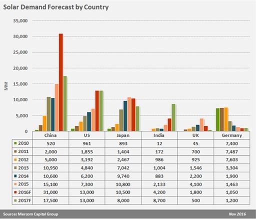 與此同時,Mercom Capital 也預測,2017 年全球光伏裝機量將保持在 70GW,比 2016 年將下降 8%,這和新能源媒體 GTM 的預測大致相當。