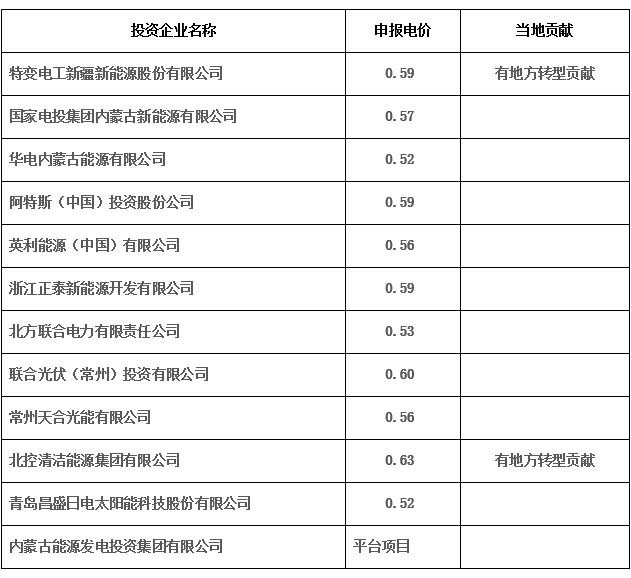 包頭和烏海光伏領(lǐng)跑者基地項目經(jīng)過激烈競標(biāo),最終確定了入圍投資商,包頭12家,最低電價0.52元/kwh;烏海7家,最低電價0.45元/kwh。具體名單如下:
