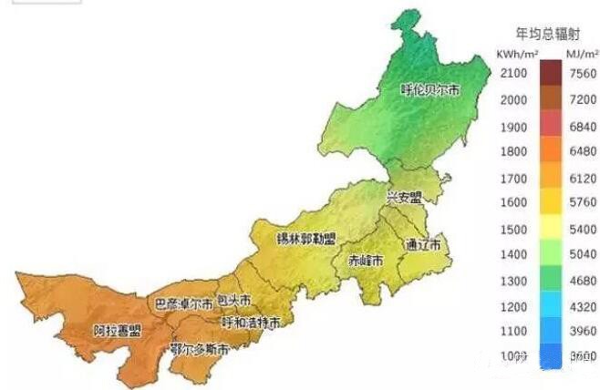 內(nèi)蒙古自治區(qū)位于我國北部,太陽能年總輻射量在1342~1948kWh/㎡之間,年日照時數(shù)在2600~3400h之間,是全國高值地區(qū)之一。全區(qū)太陽能資源分布呈自東向西遞增特點。