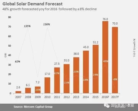 2015年全球光伏新增裝機為51GW,其中有15GW來自中國。根據Mercom Capital集團的預測,2016年全球光伏裝機增幅可達48%,新增裝機76GW,其中有超過31GW來自中國,其他來自美國(13GW)、日本(10.5GW)、印度(4.2GW)、英國(1.8GW)、德國(1.1GW)。
