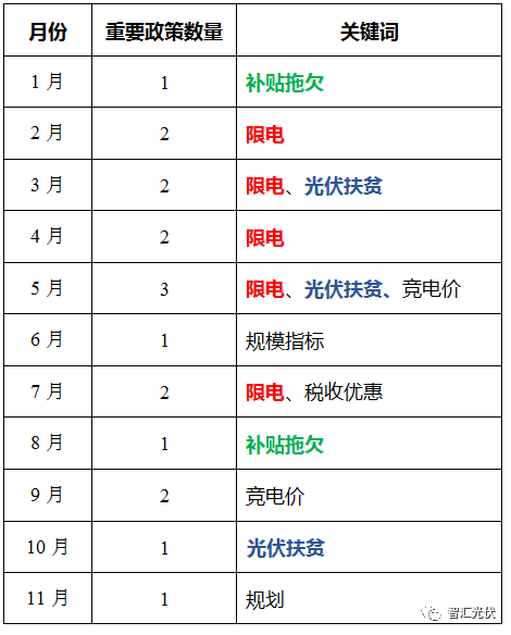 先來看看這一年國家各月出臺的光伏政策的頻率與關鍵詞,如下表。