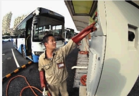 12月19日,工作人員在為新能源公交車進(jìn)行太陽能充電。