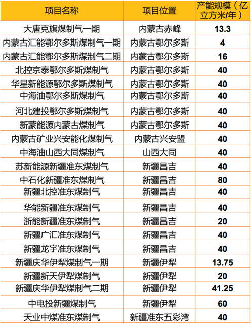 表2. 符合十三五規劃的煤制氣項目及產能明細(包括已投產的項目)