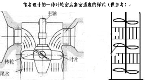 目前世界上水輪機樣式比較多,有軸流式、混流式等等,由于水機串聯模式的水量供應可以非常大,并且比較穩定和均衡,它能適應的水輪機樣式就比較多,如軸流式就比較適應巨大的流量,葉片可以增多,也可以增大,比較自由些。筆者目前認為軸流式是一個比較好的選擇。另外,也可以根據各種水輪機的優勢,集眾多水機的優點于一身,制造專用巨型特制水機。如下圖所示,就是筆者設計的一種葉輪緊密適度的樣式,供專家參考。