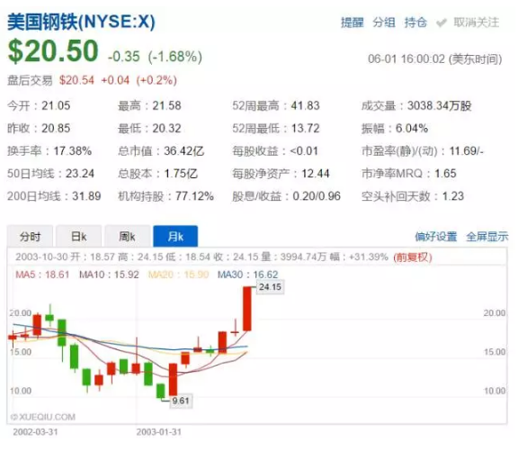 上一次“201條款”被執(zhí)行是在2002年,那一年,為了保護(hù)美國(guó)的鋼鐵行業(yè),小布什決定對(duì)進(jìn)口鋼鐵產(chǎn)品征收8–30%的關(guān)稅。在關(guān)稅被執(zhí)行的21個(gè)月里,冷軋鋼板的價(jià)格上漲了16%,同期美國(guó)鋼鐵公司(代碼:X)的股價(jià)收獲了最高286%的漲幅。然而,下游使用鋼材的制造商們的利潤(rùn)受到擠壓,最終不得不裁員來(lái)減少支出,所以“201條款”的本質(zhì)可以說(shuō)是殺敵一千自損八百的大殺器。