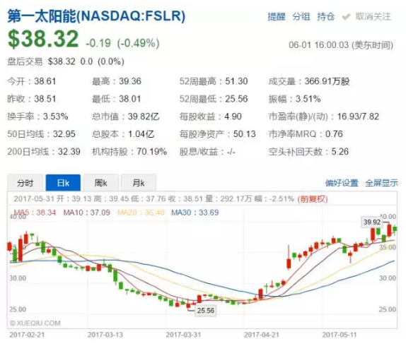 截止至2017年6月1日,第一太陽(yáng)能(代碼:FSLR)的收盤(pán)價(jià)為38.32美元,在短短兩個(gè)月的時(shí)間內(nèi),F(xiàn)SLR股價(jià)已經(jīng)從最低點(diǎn)的25.56美元反彈了50%。