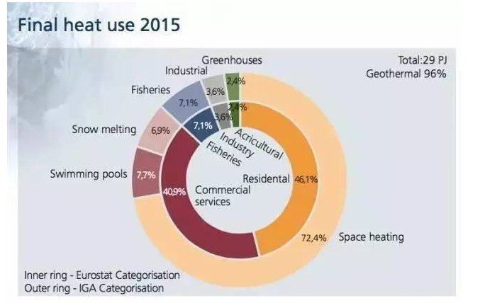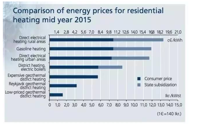 1940年以前,對燃煤供熱的過度依賴導致冰島的霧霾問題十分嚴峻。在短暫地轉向進口石油供熱后,冰島著手大規模地推進地熱供熱項目。截至2015年,據冰島能源局數據,該國的地熱供熱比重已經達到96%,全面覆蓋了居民、商業、工業、農業和漁業,環境問題得到改善的同時,供熱價格也顯著下降。