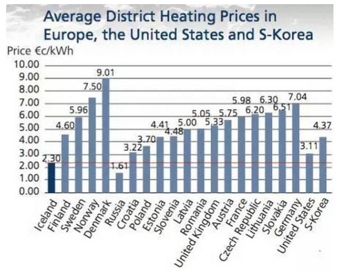 冰島的地熱開發極具經濟性。冰島能源局局長Gundi將冰島和同為高緯度北歐城市的丹麥首都哥本哈根的供熱價格“漢堡包指數”相對比,在冰島對100平方米面積的住房供熱每月該指數僅為8,而哥本哈根則高達50。