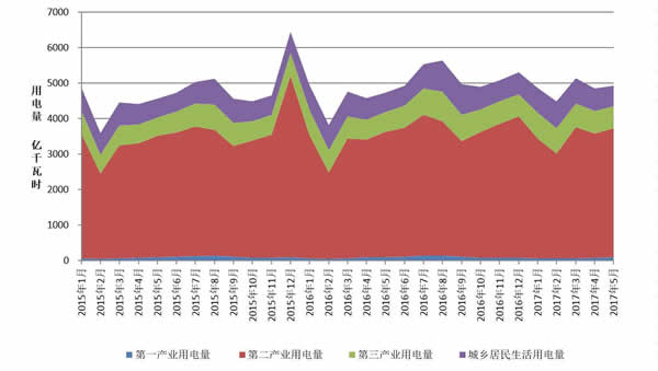 5月,分產業來看,第一產業用電量達99.99億千瓦時,同比增長3.08%;第二產業用電量3632.66億千瓦時,同比增長3.02%;第三產業用電量614.12億千瓦時,同比增長9.66%;城鄉居民生活用電量575.38億千瓦時,同比增長5.19%。