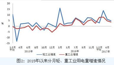 1-5月份,全國工業用電量16827億千瓦時,同比增長6.3%,增速比上年同期提高6.0個百分點,占全社會用電量的比重為69.4%,對全社會用電量增長的貢獻率為69%。其中,輕工業用電量為2826億千瓦時,同比增長6.1%,增速比上年同期提高2.7個百分點;重工業用電量為14001億千瓦時,同比增長6.4%,增速比上年同期提高6.6個百分點。