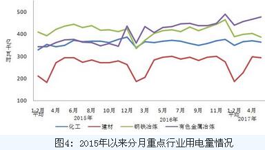 5月份,四大高載能行業用電量合計1520億千瓦時,同比增長1.1%,增速比上年同期提高2.0個百分點,占全社會用電量的比重為30.6%。其中,化工行業用電量364億千瓦時,同比增長1.2%,增速比上年同期回落4.5個百分點;建材行業用電量293億千瓦時,同比下降0.7%,增速比上年同期回落1.5個百分點;黑色金屬行業用電量385億千瓦時,同比下降8.2%,增速比上年同期回落3.4個百分點;有色金屬冶煉行業477億千瓦時,同比增長11.3%,增速比上年同期提高14.8個百分點。