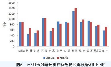 分類型看,1-5月份,全國水電設備平均利用小時為1161小時,同比降低134小時;在水電裝機容量超過1000萬千瓦的7個省份中,除云南外,其余省份水電設備平均利用小時同比均有不同程度降低,其中貴州、廣西和湖南降幅超過300小時,同比分別降低605、534和388小時。全國火電設備平均利用小時為1677小時,同比增加42小時;分省份看,全國共有10個省份火電利用小時數超過全國平均水平,其中,江蘇、河北和山東火電設備平均利用小時數超過2000小時,而云南和西藏火電利用小時數分別為543和54小時;與上年同期相比,全國共有20個省份火電利用小時數同比增加,其中湖南和江西同比增加超過200小時,福建、廣東、陜西、青海、浙江、寧夏和貴州同比增加超過100小時;而海南、北京和重慶同比降低超過100小時,分別降低239、132和105小時。全國核電設備平均利用小時2816小時,同比增加62小時。全國風電設備平均利用小時852小時,同比增加59小時。