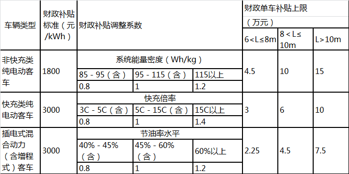 1、新能源公交車補貼金額=車輛帶電量x單位電量補貼標準x調整系數(調整系數:系統能量密度/充電倍率/節油水平),具體如下: