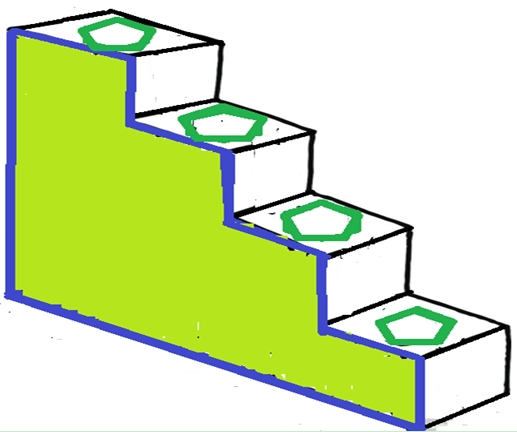 第五, 水頭規(guī)律充分利用。可以按水頭大小規(guī)律來安裝水機(jī),盡量做到物盡其用。下圖是一個(gè)臺(tái)階圖案,其實(shí)是一個(gè)總水道,每個(gè)臺(tái)階分管接入,分管容量之和與總水道容積相當(dāng)。總水道都埋藏在臺(tái)階內(nèi)部,各水機(jī)由分管連接,組成一個(gè)多邊形圖案,非常美觀。