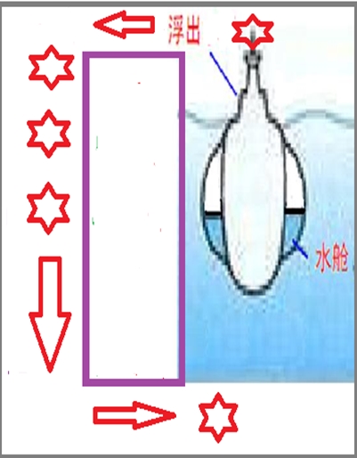 右側(cè)潛水艇樣裝置內(nèi)有儲氣艙,裝有液態(tài)空氣,上浮時擠出水艙內(nèi)的水,再下沉?xí)r將液態(tài)空氣收回儲氣艙,水艙重新注滿水。