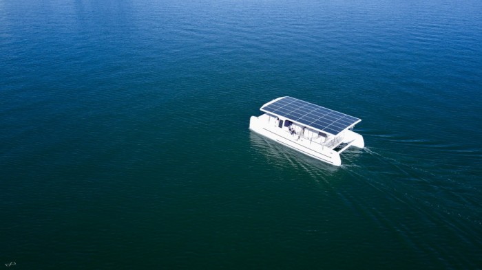 該太陽能電池陣列結(jié)合了兩塊60 kWh電池和兩臺30 kW電動機(jī),最高航速為14節(jié)。設(shè)計師David Czap解釋說,這種推進(jìn)系統(tǒng)是推動12米(39英尺)長的玻璃纖維船前行。