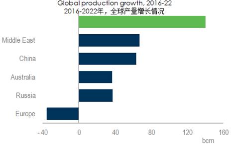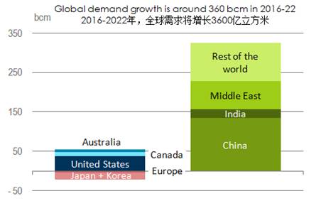 在供應(yīng)方面,美國(guó)現(xiàn)在已經(jīng)是世界上最大的天然氣生產(chǎn)國(guó),美國(guó)目前的增長(zhǎng)速度也是全球最高的,到2022年,美國(guó)將占全球產(chǎn)量增長(zhǎng)的40%。此外,中東地區(qū)產(chǎn)量將繼續(xù)增長(zhǎng);中國(guó)也將成為第四大天然氣生產(chǎn)國(guó)。