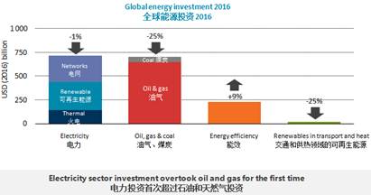 2016的全球能源投資為1.7萬(wàn)億美元,占全球國(guó)內(nèi)生產(chǎn)總值(GDP)的2.2%。其中,電力部門投資首次超過(guò)石油、天然氣和煤炭的投資總和,而清潔能源的投資占總投資的43%,創(chuàng)歷史新高。