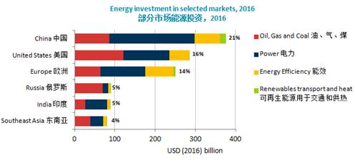 中國(guó)作為世界上最大的能源投資者,2016年占全球總投資的21%,雖然去年中國(guó)在燃煤電力領(lǐng)域的投資降低了25%,但是清潔能源發(fā)電、電網(wǎng)建設(shè)和能效方面的投資則日益增加。在美國(guó),雖然2016年石油和天然氣的投資急劇下降,但其能源投資仍然占全球總投資的16%。印度是去年增長(zhǎng)最快的主要能源投資市場(chǎng),由于政府大力推動(dòng)現(xiàn)代化和電力行業(yè)的發(fā)展,其能源投資增長(zhǎng)了7%,從而穩(wěn)居全球第三大能源投資市場(chǎng)。