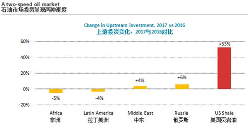 《報(bào)告》顯示,在經(jīng)歷了兩年史無(wú)前例的下降后,全球石油和天然氣上游的投資預(yù)計(jì)將在2017穩(wěn)定下來(lái)。然而,美國(guó)頁(yè)巖氣投資的上升與世界其他地區(qū)的停滯形成對(duì)比,這預(yù)示著石油雙速市場(chǎng)的出現(xiàn)。與此同時(shí),石油和天然氣行業(yè)正在通過(guò)大量的成本節(jié)約、技術(shù)開發(fā)以及高效的項(xiàng)目執(zhí)行來(lái)取得改觀。