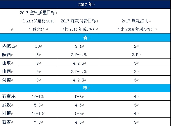 地方試點目標:在2020年地方空氣質量和煤控指標的約束下,2017年地方試點空氣質量和煤耗目標需滿足“大氣十條”的要求,尤其京津冀及周邊地區空氣質量要有明顯改善見,表1。