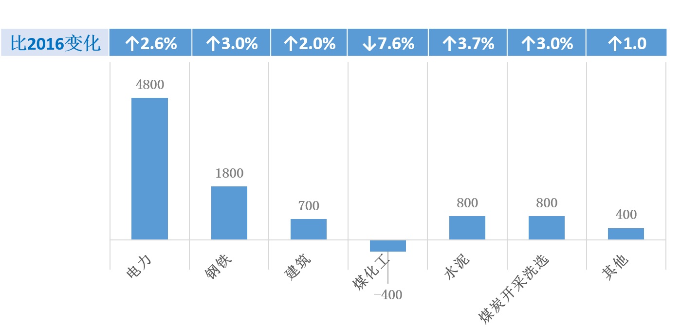 部門煤控目標:2017年煤耗總量下降目標4.2%中,部門的貢獻率在55%以上,即減少0.89億噸煤,其中電力、鋼鐵、水泥、煤化工在4.2%的總目標中貢獻約2%,見圖3。在部門煤控的各項工作中,制定高目標。2017年6月堅決徹底地淘汰地條鋼生產企業。僵尸企業在2017年6月底全部清除完畢,技術落后、高污染和安全生產風險高的企業要停產整頓和關閉,小、散、亂、污企業要清理。