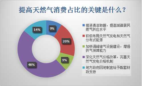 9%的受訪者認為,應當推進清潔取暖,提高城鎮(zhèn)居民燃氣供應水平;幾乎同比例受訪人群認為,加快調(diào)峰儲氣設施建設,增強供氣保障能力;14%的受訪者認為地方政府因地制宜給予配套財政支持;20%的受訪者認為應該積極布局天然氣發(fā)電和天然氣分布式能源;48%的受訪者認為應當深化天然氣價格改革,完善天然氣發(fā)電價格機制。