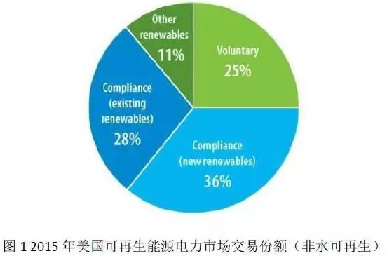 以2015年為例,美國自愿綠電市場的交易電量已經占據了非水可再生能源電力交易的四分之一(圖1)。自愿的綠電市場與為滿足配額制要求而存在的強制市場相輔相成,共同促進了美國可再生能源的發展。
