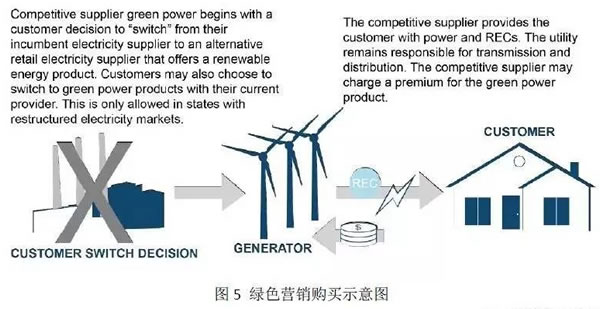 不同于前者,綠色營銷適用于已經放開電力管制的地區,電力用戶可選擇從原有的公共事業公司購電,也可選擇其他競爭性電力供應商。同綠色標價類似,電力用戶需支付額外費用給電力供應方,以覆蓋REC的價格。