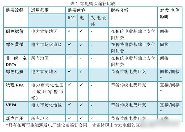 表1 總結了以上六種綠電購買途徑的異同。