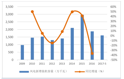 受到2016 年標(biāo)桿電價(jià)下調(diào)影響,2015 年國(guó)內(nèi)風(fēng)電行業(yè)搶裝明顯,當(dāng)年實(shí)現(xiàn)新增裝機(jī)超30GW,同比增50%以上。而 2016 年國(guó)內(nèi)新增裝機(jī)不足 24GW,其中華北、華東地區(qū)風(fēng)電新增裝機(jī)增長(zhǎng)明顯,華東占比提升7 個(gè)百分點(diǎn)至 20%。而西北地區(qū)大幅下降 8 個(gè)百分點(diǎn)至 26%,體現(xiàn)了裝機(jī)區(qū)域向中東部和南部轉(zhuǎn)移的趨勢(shì)。