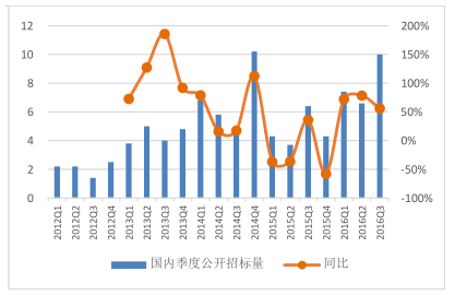 2016 年前三季度累計(jì)招標(biāo)量為 24GW,較去年同期增長(zhǎng)68%,創(chuàng)歷史新高。而對(duì)比 15年的搶裝現(xiàn)象,14 年同期的招標(biāo)量?jī)H為17.3GW,而14 年全年的招標(biāo)量也僅為27.5GW,與今年相比明顯較弱。主要原因是區(qū)域電力企業(yè)及火電企業(yè)由于火電受限,同時(shí)風(fēng)電成本下降投資回報(bào)率合理,轉(zhuǎn)型發(fā)展風(fēng)電所致。