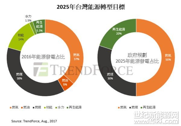 再者是再生能源的發展。再生能源無疑是政府要推動非核家園不可缺少的一環。從再生能源的類型來看,生質能與水力的發電具可控制特性,但臺灣的發展政策較重視的太陽光電與離岸風力則屬于不可控制的發電類型。政府目標要將再生能源發電占比提高到20% ,意味著有20%的電力將來自這些發電不穩定的機組。