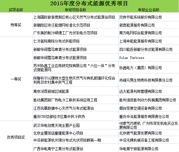 為肯定和表彰本年度在中國分布式能源領域做出突出貢獻的企業與個人,由中國能源網發起、會議主辦方大力支持的“2015(第十一屆)分布式能源國際論壇獎項評選”活動結果在會議期間正式公布。獎項分為:2015年度中國分布式能源優秀項目獎、優秀設計單位獎、杰出貢獻人物獎。