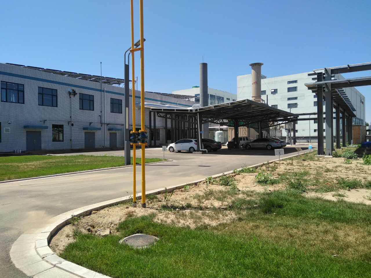 為解決用戶燃煤鍋爐拆除帶來的蒸汽缺口建設分布式能源站,主要工藝路線為:燃氣輪機(5500kw)+余熱蒸汽鍋爐+燃氣蒸汽鍋爐。發電采用并網不上網方式。生活熱水由太陽能光熱系統滿足,并在停車棚建設光伏發電板及充電樁為電動汽車充電。