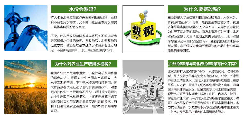 為全面貫徹落實黨的十九大精神,推進資源全面節約和循環利用,推動形成綠色發展方式和生活方式,按照黨中央、國務院決策部署,自2017年12月1日起在北京、天津、山西、內蒙古、山東、河南、四川、陜西、寧夏等9個省(自治區、直轄市)擴大水資源稅改革試點。現將《擴大水資源稅改革試點實施辦法》印發給你們,請遵照執行。