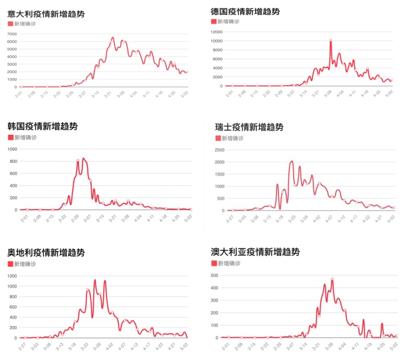 二是顯著的長尾效應。病來如山倒、病去如抽絲,疫情爆發后,至少要經歷與上升期一樣長、乃至更長的時間,才可能穩定在高峰值的一半左右,從而結束高位波動、進入真正的下降通道,圖形曲線如同一條長長的尾巴。例如中國湖北,2周左右快速上升之后,是2周左右高位波動+4周左右非勻速下降+3周觀察鞏固=長達9周的長尾。又如韓國,在1周時間沖上數據高峰之后,又經歷了大約7周才進入每日新增個位數的疫情尾聲。而如德國、意大利,雖已進入下降期,但每日新增數據依然在1000以上、2000左右數量級,距離真正的尾聲還需假以時日。